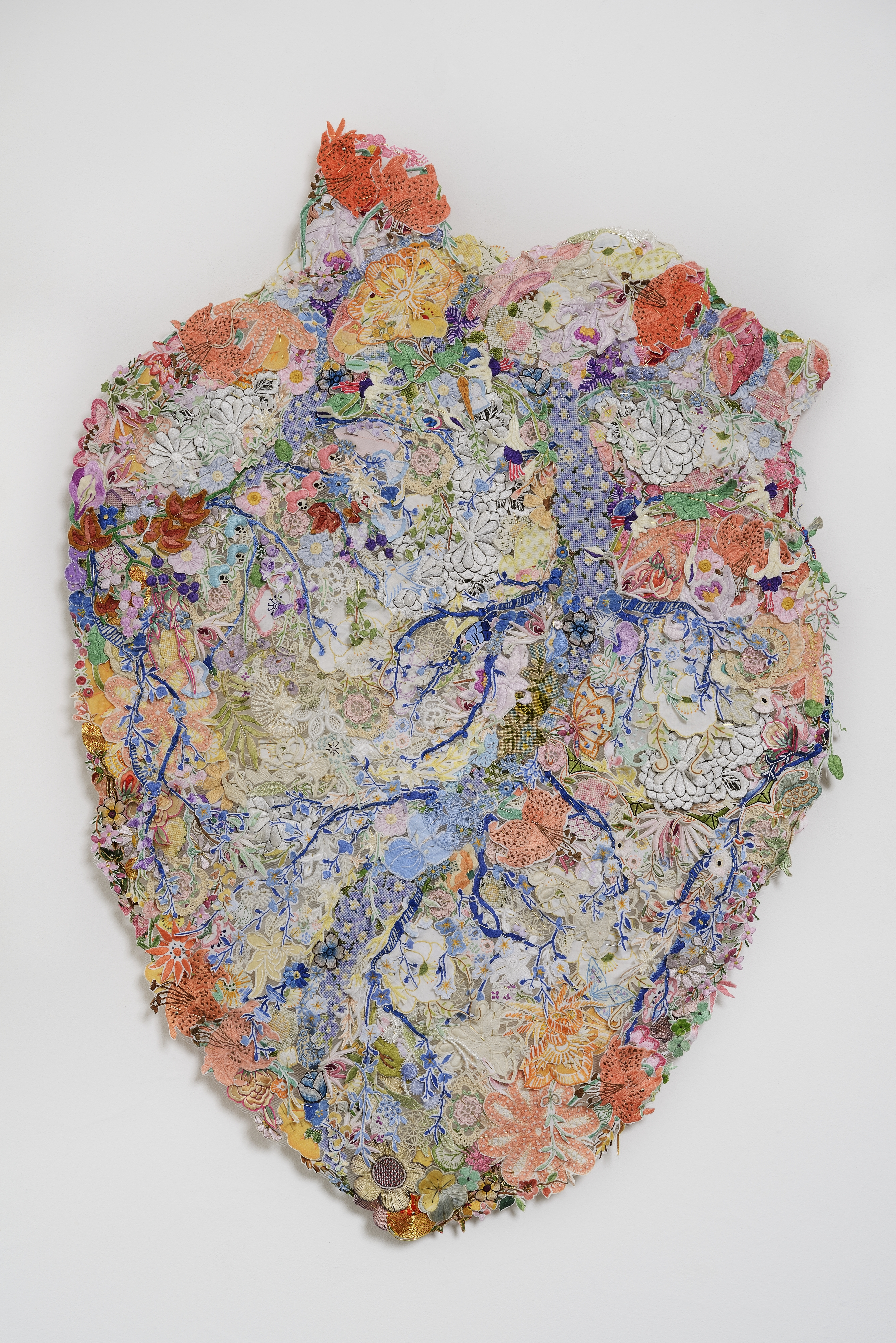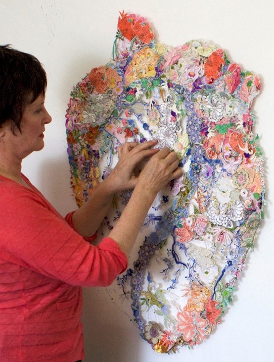 "A human heart motif has become a garden filled with the exquisite hand-work of many anonymous makers and also some belonging to family members of friends and acquaintances. I thank them all for their contributions and dedicate this work to them."